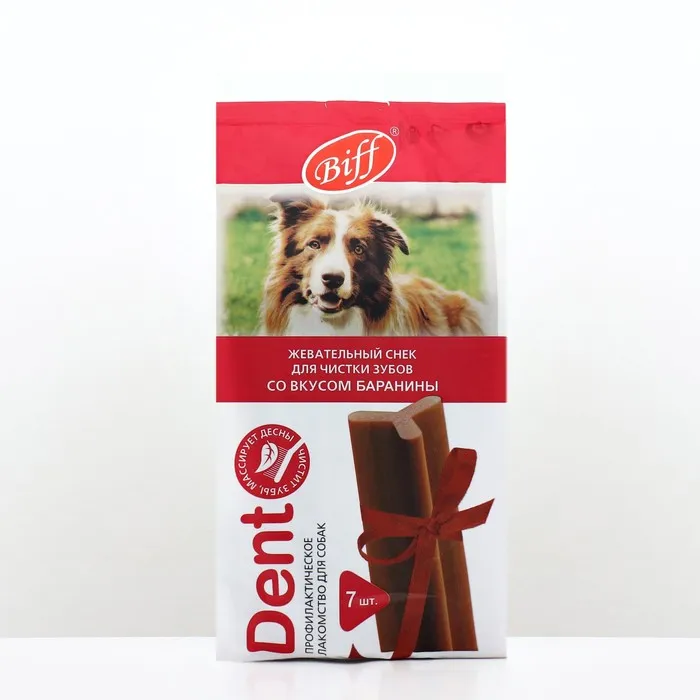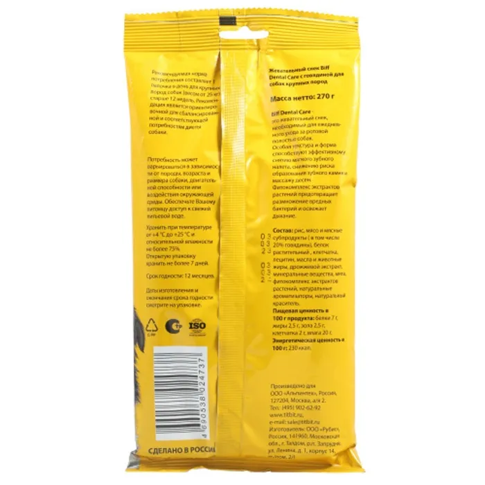 Biff Dental Care - это жевательный снек, необходимый для ежедневного ухода за ротовой полостью собак. Особая текстура и форма способствуют эффективному снятию мягкого зубного налета, снижению риска образования зубного камня и массажу десен. Фитокомплекс экстрактов растений предотвращает размножение вредных бактерий и освежает дыхание.