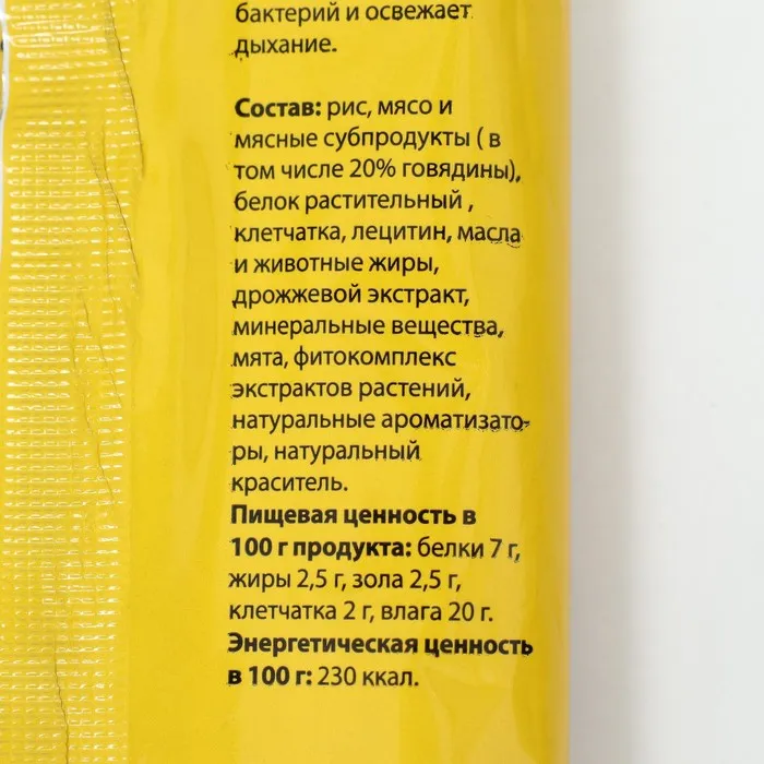 Ингредиенты: рис, мясо и мясные субпродукты (в том числе 20% говядины), белок растительный, клетчатка, лецитин, масла и животные жиры, дрожжевой экстракт, минеральные вещества, мята, фитокомплекс экстрактов растений, натуральные ароматизаторы, натуральный краситель.