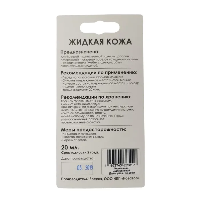 Рекомендации: перед использованием взболтать флакон. Очистить поврежденное место чистой тканью. Нанести средство на поврежденное место 1-3 слоя. Флакон плотно закрыть. Время высыхания 20 мин. При замерзании жидкой кожи, во избежание повреждения кисточки, дайте ей возможность оттаять. Жидкую кожу можно колеровать между собой. Хранить с плотно закрытой крышкой. Не глотать и не вдыхать. Избегать попадания в глаза. Беречь от детей. Срок годности 2 года с даты изготовления см. на упаковке. Морозоустойчива до – 25 °C.