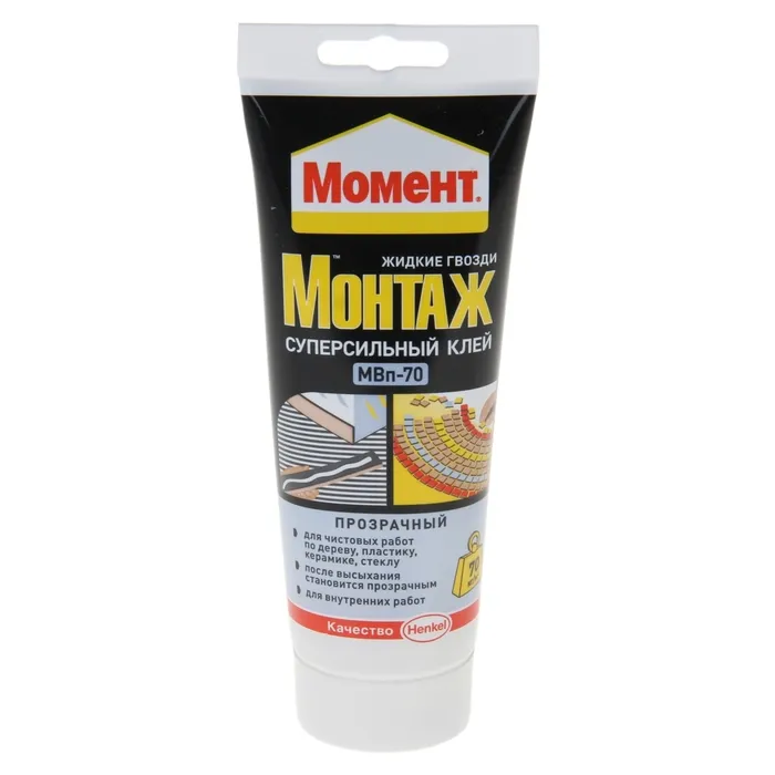 Клей «Момент» является достойным аналогом обычных гвоздей, шурупов и дюбелей. Продукт изготовлен на основе полиакрилат-водной дисперсии.