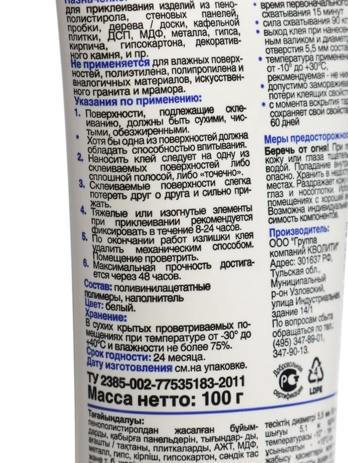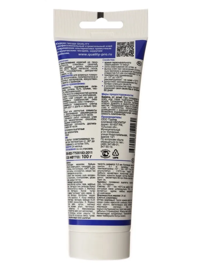 Жидкие гвозди Quality, универсальные, тюбик, 100 мл — Характеристики