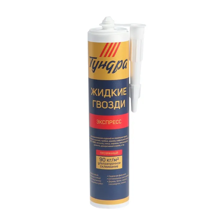 Жидкие гвозди от марки «ТУНДРА» предназначен для наклеивания изделий из пенополистирола, стеновых панелей, пробки, дерева, кафельной плитки, ДСП, МДФ, металла, гипса, кирпича, гипсокартона, цемента, декоративного камня, и пр.