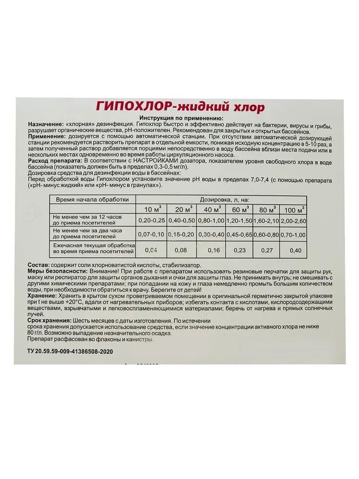 Рекомендации:При повышенных температурах, а также интенсивном использовании бассейна, в соответствии с показаниями хлор-тестера, необходимо увеличивать дозировку препарата или частоту обработки воды в бассейне.