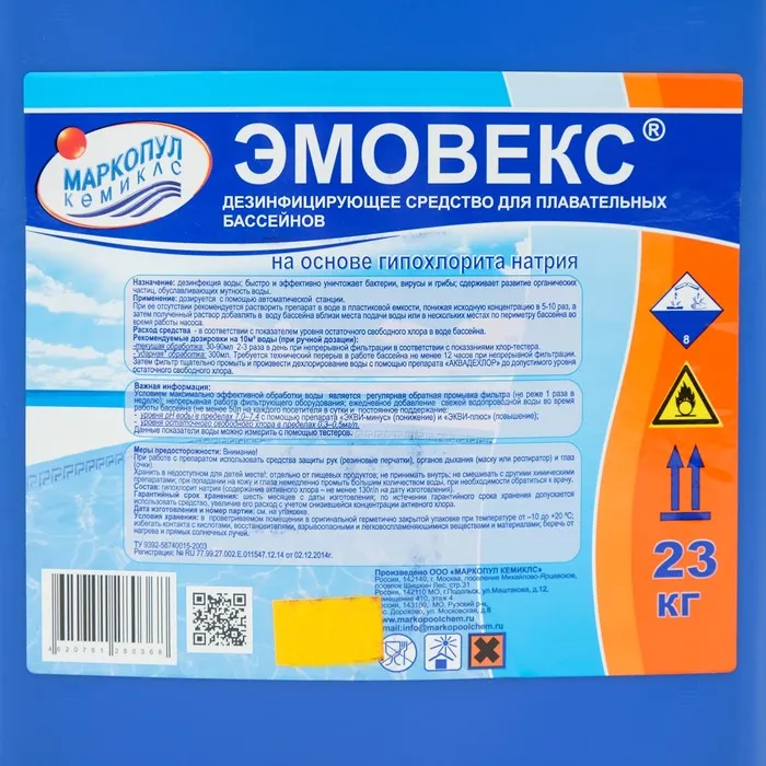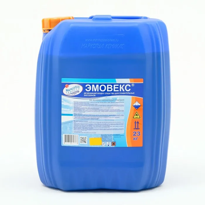 Дезинфицирующее средство для плавательных бассейнов на основе гипохлорита натрия. Дезинфекция воды, быстро и эффективно уничтожает бактерии, вирусы и грибок. Сдерживает развитие органических частиц, обуславливающих мутность воды. Условием максимально эффективной обработки воды является регулярная обратная промывка фильтра (не реже 1 раза в неделю). Ежедневное добавление свежей водопроводной воды во время работы бассейна (не менее 50 л на каждого посетителя в сутки и постоянное поддержание: