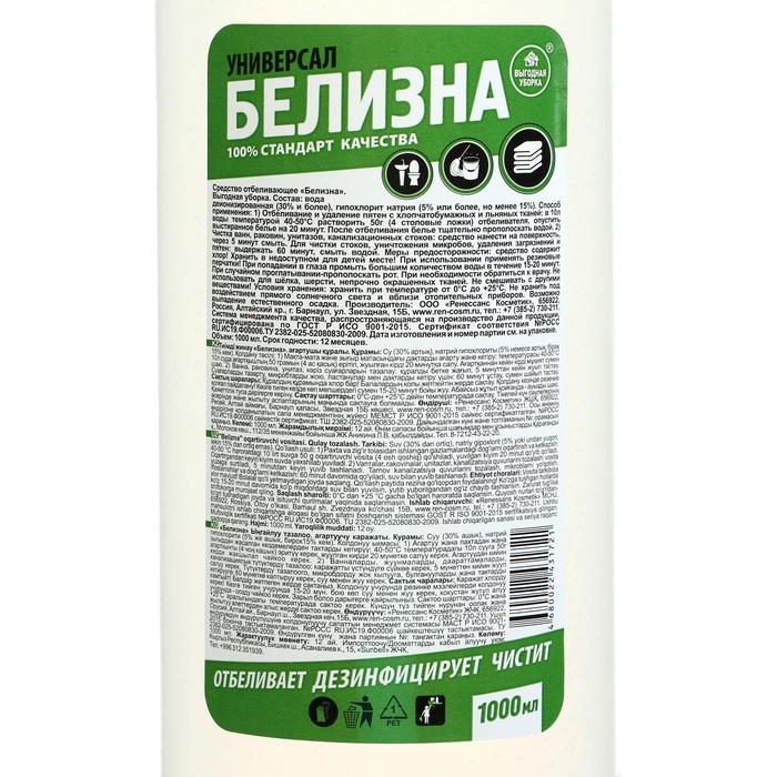 Хлоросодержащее средство «Белизна» универсал применяется для отбеливания и удаления пятен с тканей, чистки ванн, раковин, унитазов, канализационных стоков, мытья пола, кафеля. Эффективно удаляет загрязнения, устраняет неприятный запах и уничтожает микробов. Подходит для стирки, замачивания, отбеливания вещей. Эффективна при чистке унитазов, душевых кабин, устраняет въевшиеся загрязнения.
