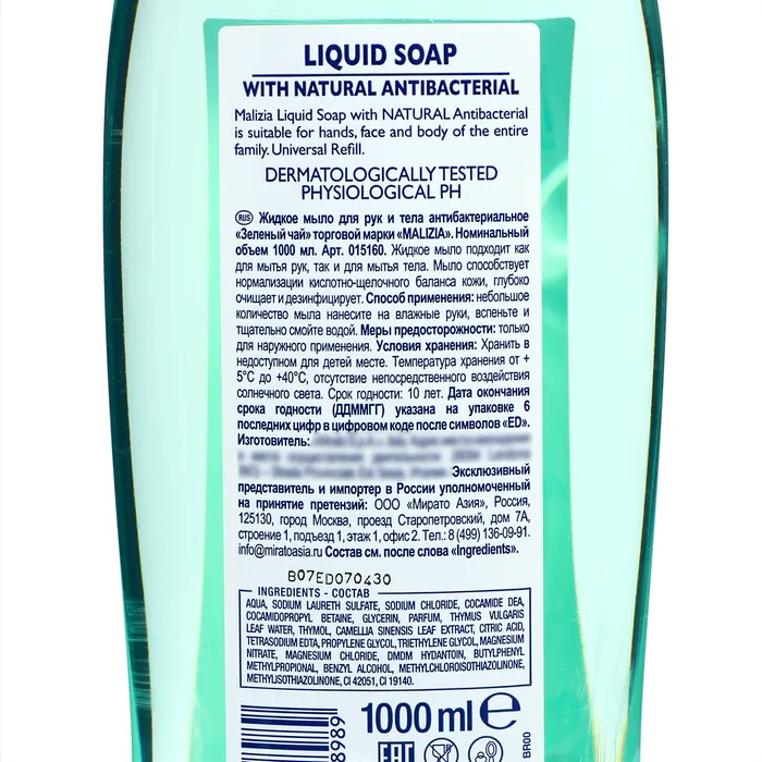 Жидкое антибактериальное мыло для рук и тела "Зеленый чай" MALIZIA — это натуральное и безопасное средство для очищения кожи. Оно создано на основе зеленого чая, который обладает антиоксидантными, противовоспалительными и антибактериальными свойствами.