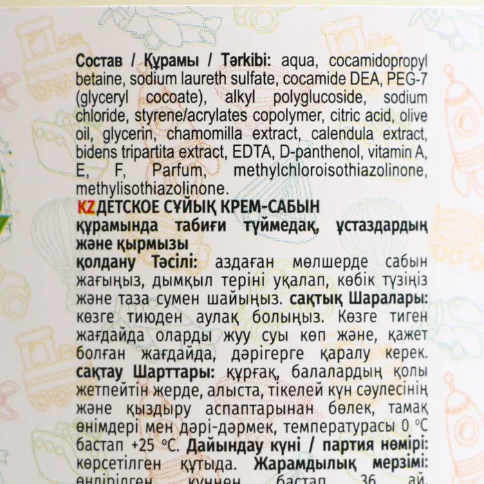 Состав: aqua, cocamidopropyl betaine, sodium laureth sulfate, cocamide DEA, PEG-7 (glyceryl cocoate), alkyl polyglucoside, sodium chloride, styrene/acrylates copolymer, citric acid, olive oil, glycerin, chamomilla extract, calendula extract, bidens tripartita extract, EDTA, D-panthenol, vitamin A, E, F, Parfum, methylchloroisothiazolinone, methylisothiazolinone