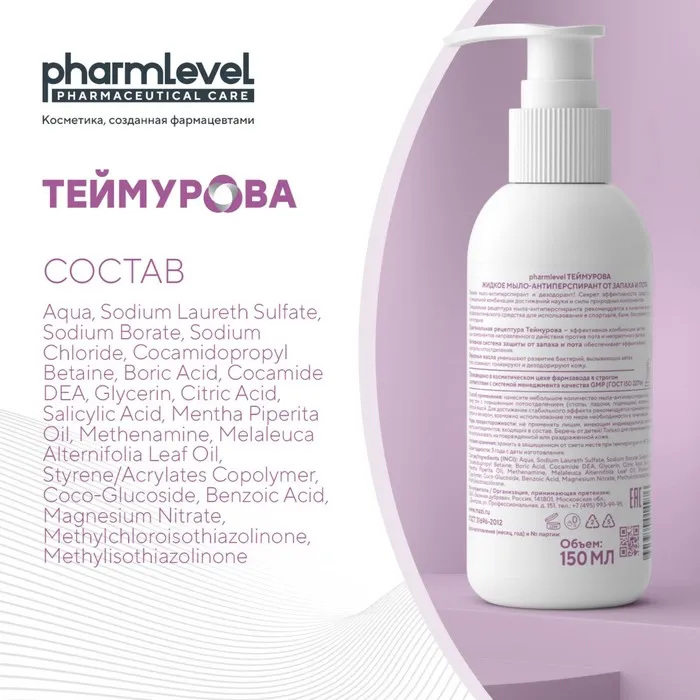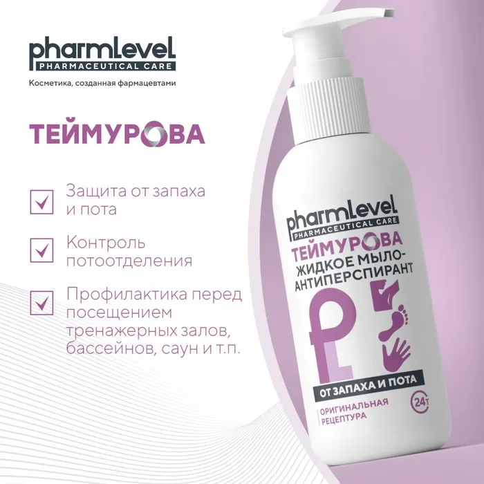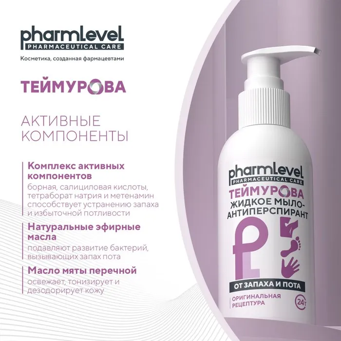 Описание: жидкое мыло-антиперспирант Теймурова – новое эффективное средство для контроля потоотделения и снижения запаха пота, которое подходит всем взрослым. Секрет эффективности жидкого мыла-антиперспиранта теймурова − в уникальной комбинации достижений науки и силы природняых компонентов. Активные ингредиенты в составе уменьшают потоотделение, а натуральные эфирные масла подавляют развитие бактерий, вызывающих запах пота. Масло мяты перечной освежает, тонизирует и дезодорирует кожу. Отлично подобранная пропорция компонентов мыла-антиперспиранта позволяет использовать его в качестве ежедняевного профилактического средства в условиях повышенного потоотделения: в спортзале, бане, бассейне и при активном отдыхе. Эффективный контроль потоотделения 24 часа в сутки!