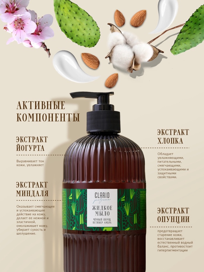 Даже жидкое мыло должно приносить удовольствие. Мягкая пена дарит приятную тактильность, эффективно очищает, не нарушая гидролипидную мантию кожи, а экстракты миндаля, хлопка, йогурта и опунции благотворно влияют на кожу и помогают ей противостоять времени и внешним факторам окружающей среды. Чистота и шлейф восхитительного аромата будут сопровождать долгое время.