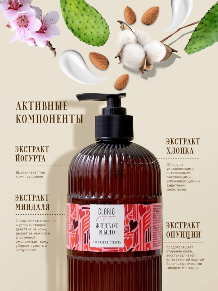 Даже жидкое мыло должно приносить удовольствие. Мягкая пена дарит приятную тактильность, эффективно очищает, не нарушая гидролипидную мантию кожи, а экстракты миндаля, хлопка, йогурта и опунции благотворно влияют на кожу и помогают ей противостоять времени и внешним факторам окружающей среды. Чистота и шлейф восхитительного аромата будут сопровождать долгое время.
