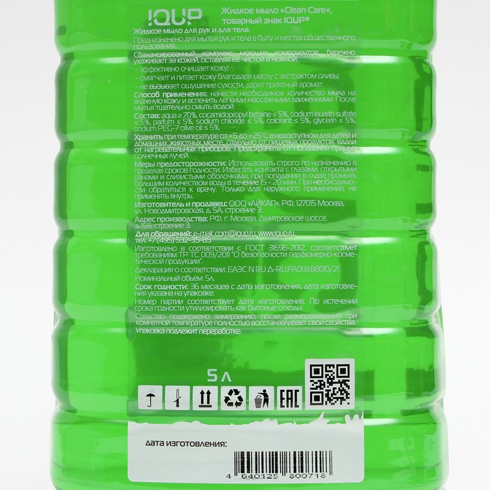 Жидкое мыло IQUP Clean Care Green, зеленое ПЭТ, 5 л — Характеристики