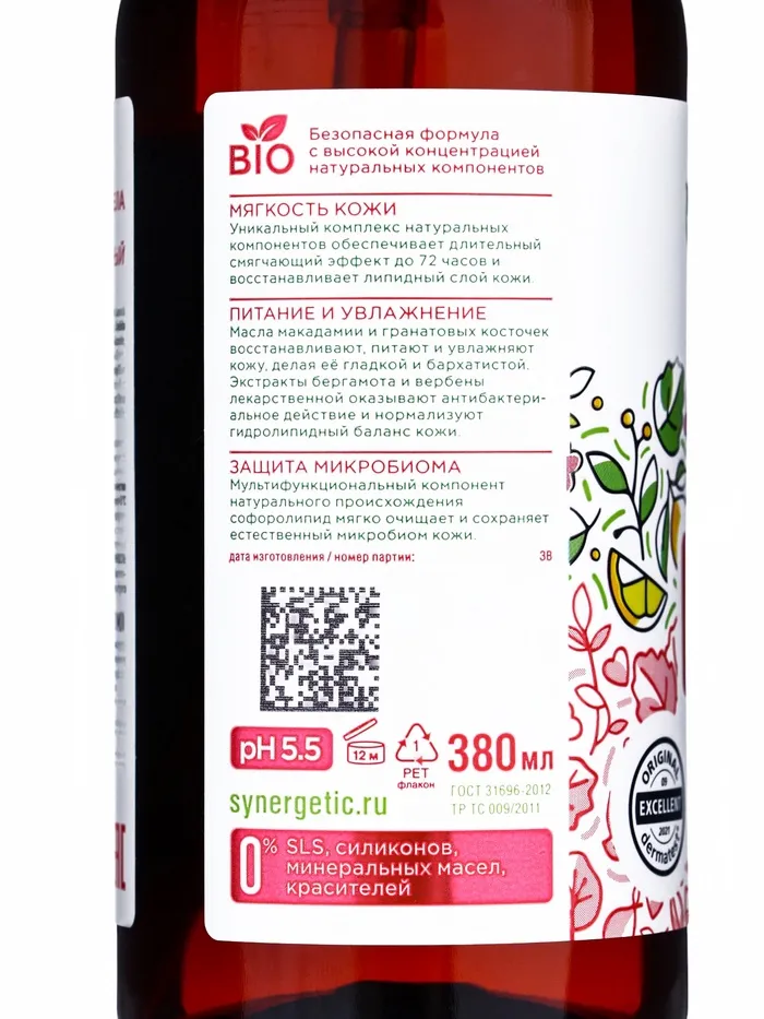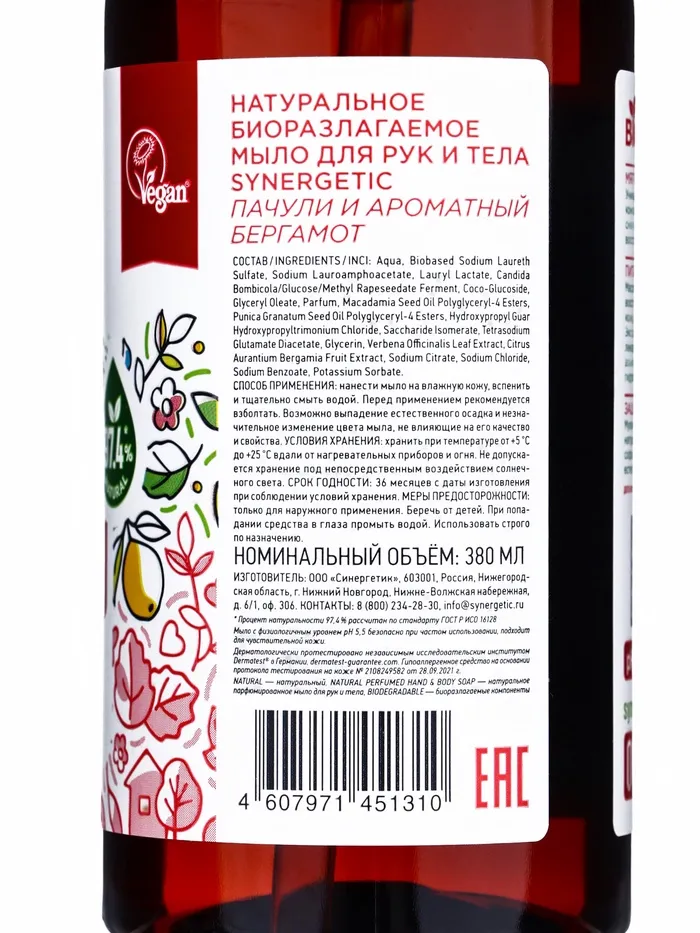 Жидкое мыло Synergetic «Пачули и ароматный бергамот», 380 мл — Характеристики