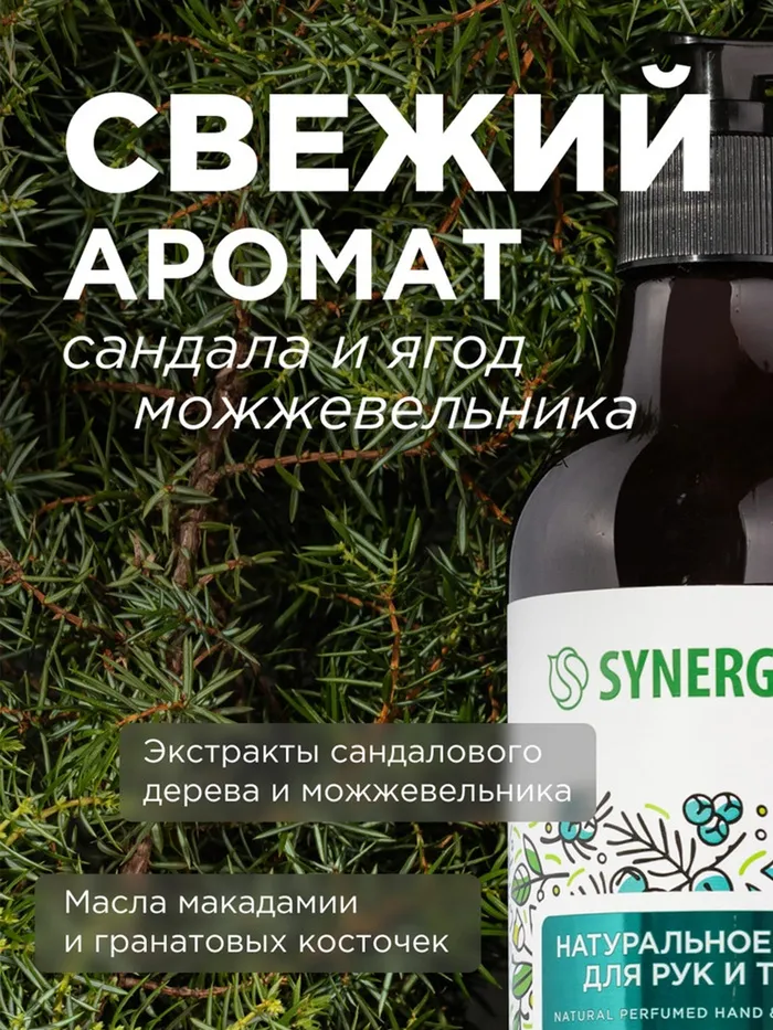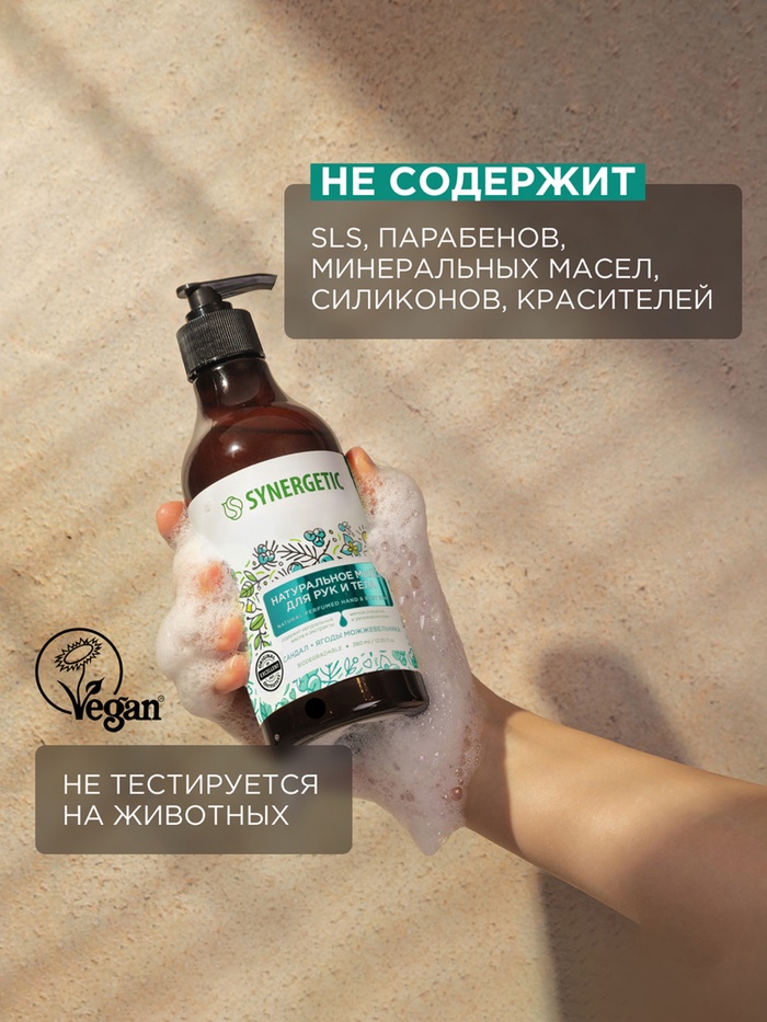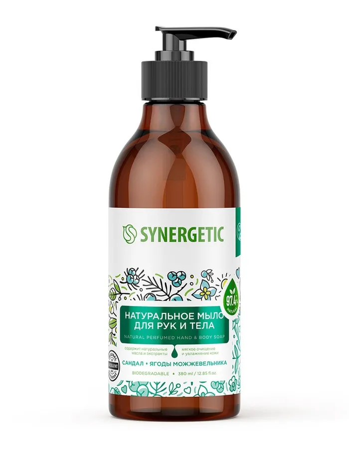 Натуральное биоразлагаемое мыло для рук и тела SYNERGETIC "Сандал и ягоды можжевельника" - это деликатное средство для очищения кожи, более чем на 99% состоящее из натуральных компонентов. Гипоаллергенный аромат мыла разработан в швейцарском доме Givaudan с использованием натуральных эфирных масел пачули, ладанника, герани, гурьюнского бальзама и розового перца. Масла макадамии и гранатовых косточек восстанавливают, питают и увлажняют кожу, делая её гладкой и бархатистой. Экстракты сандалового дерева и можжевельника увлажняют кожу и оказывают тонизирующий эффект. Софоролипид из рапсового масла мягко очищает и сохраняет естественный микробиом кожи. Уникальный комплекс натуральных компонентов на основе глицерина и растительных сахаров обеспечивает длительный смягчающий эффект до 72 часов. Физиологичный уровень pH 5,5 гарантирует мягкость кожи и безопасность при частом использовании даже для чувствительной кожи. Мыло дерматологически протестировано независимым исследовательским институтом Dermatest®️ в Германии. Средство не содержит SLS, парабенов, минеральных масел, силиконов, красителей и компонентов животного происхождения, не тестируется на животных и сертифицировано британской организацией The Vegan Society. Знак Vegan – мировой стандарт этичной продукции. Нанести мыло на влажную кожу, вспенить и тщательно смыть водой. Перед применением рекомендуется взболтать. Возможно выпадение естественного осадка и незначительное изменение цвета мыла, не влияющие на его качество и свойства. При попадании средства в глаза промыть водой. Использовать под присмотром взрослых. Aqua, Sodium Cocoamphoacetate, Cocamidopropyl Betaine, Glycerin, Caprylyl/Capryl Glucoside, Candida Bombicola/Glucose/Methyl Rapeseedate Ferment, Avena Sativa (Oat) Kernel Extract, Sweet Almond Oil Polyglyceryl-4 Esters, Aloe Barbadensis Leaf Juice, Trehalose, Parfum, Lactic Acid, Bisabolol, Saccharide Isomerate, Dehydroacetic Acid, Benzyl Alcohol, Benzoic Acid, Sodium Benzoate, Potassium Sorbate, Citric Acid, Sodium Citrate.