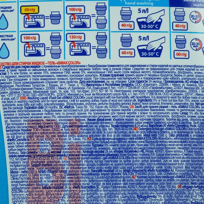 Жидкое средство для стирки BiMax Color Iq smart, гель, для разноцветных тканей, 1.3 л
