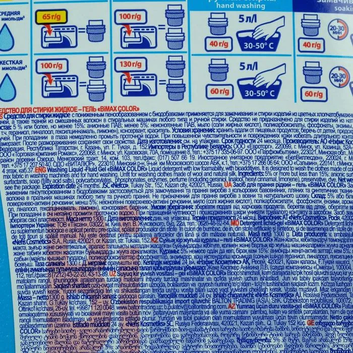 Способ применения: При среднем загрязнение берем 65 г порошка, при сильном загрязнение 100 г порошка.( средняя жесткость воды). Ручная стирка берем 5 л воды и 40 гр порошка. При среднем загрязнение берем 100г порошка и сильном загрязнение 130 г порошка. ( жесткая вода). Ручная стирка берем 5 л воды и 60 гр порошка.