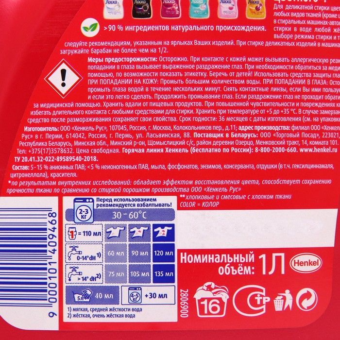 Жидкий порошок Ласка Восстановление COLOR для цветного эффективно и бережно отстирывает загрязнения на одежде, восстанавливая яркость цвета и сохраняя прочность волокон ткани. В отличие от обычного стирального порошка, Ласка содержит цветозащитные ингредиенты, которые поддерживают стойкость цвета одежды. Активные компоненты способствуют уменьшению количества катышков на ткани. Формула содержит более 90% ингредиентов натурального происхождения.