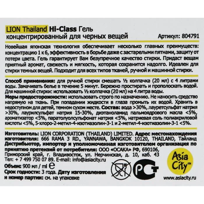 Жидкое средство для стирки Lion Thailand Hi Class, гель, для чёрных тканей, 900 мл — Характеристики