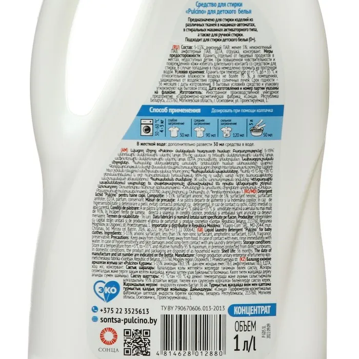 Жидкое средство для стирки Pulcino для детского белья легко выполаскивается из волокон без остатка, не содержит хлора, красителей, парабенов, фосфатов.