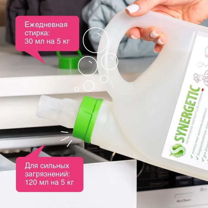 Биоразлагаемый концентрированный гель для стирки SYNERGETIC для белого и светлого белья предназначен для использования в стиральных машинах любого типа и ручной стирки при температуре 20 - 90 °C. Уникальный комплекс растительных тензидов, натурального мыла и зеленых хелатов обеспечивает бережное и эффективное очищение белых и светлых тканей.