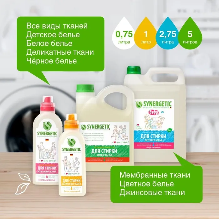 Биоразлагаемый концентрированный гель для стирки SYNERGETIC для цветного белья предназначен для использования в стиральных машинах любого типа и ручной стирки при температуре 20 - 90 °C. Уникальный комплекс растительных тензидов, натурального мыла и зеленых хелатов обеспечивает бережное и эффективное очищение цветных тканей. Гель предназначен для стирки всех видов тканей, кроме деликатных и мембранных, а также шерсти и шелка.