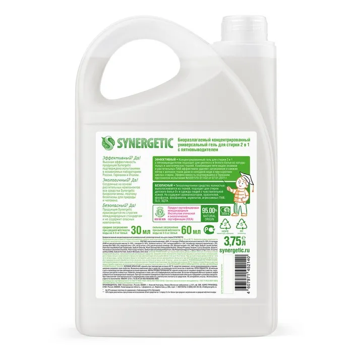 Биоразлагаемый концентрированный гель для стирки 2 в 1 c пятновыводителем SYNERGETIC предназначен для использования в стиральных машинах любого типа, ручной стирки при температуре 15 - 90 °C, а также для предварительной обработки пятен. Комбинация пяти видов энзимов и растительных ПАВ позволяет эффективно удалять трудновыводимые и свежие пятна с волокон ткани даже в холодной жесткой воде и при коротких циклах стирки.