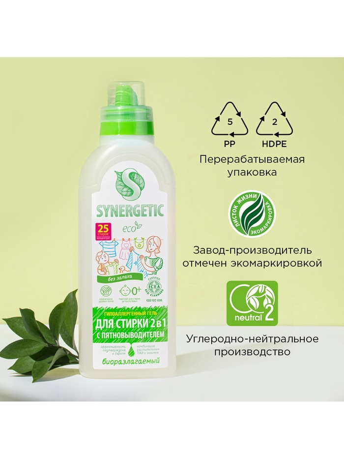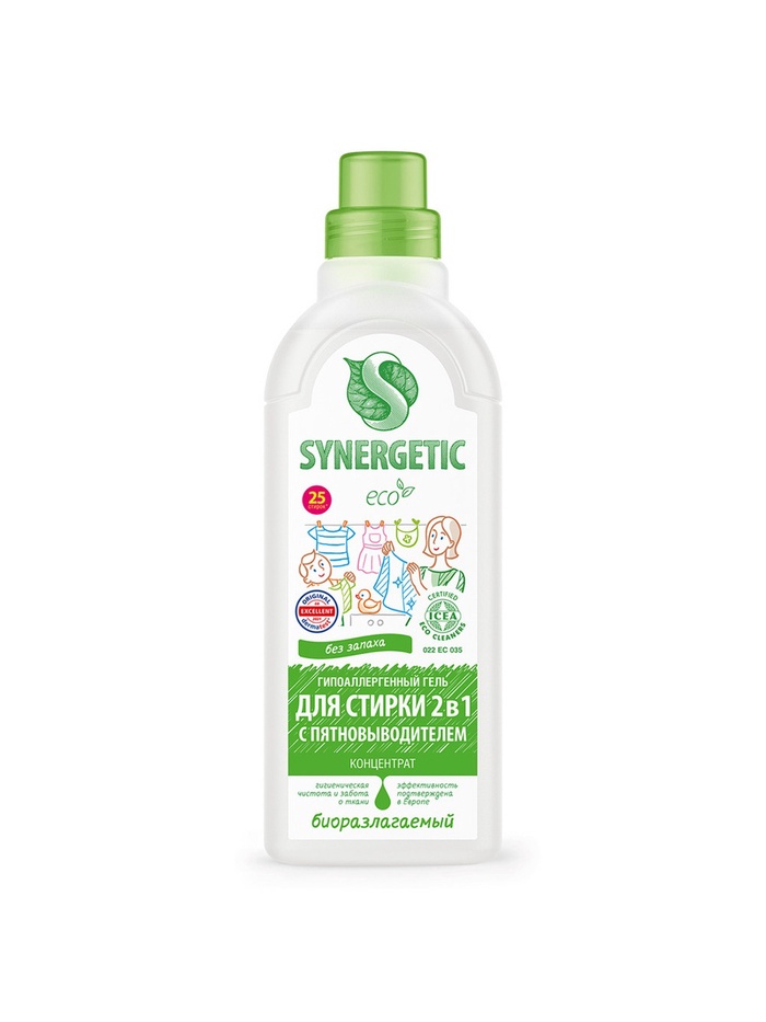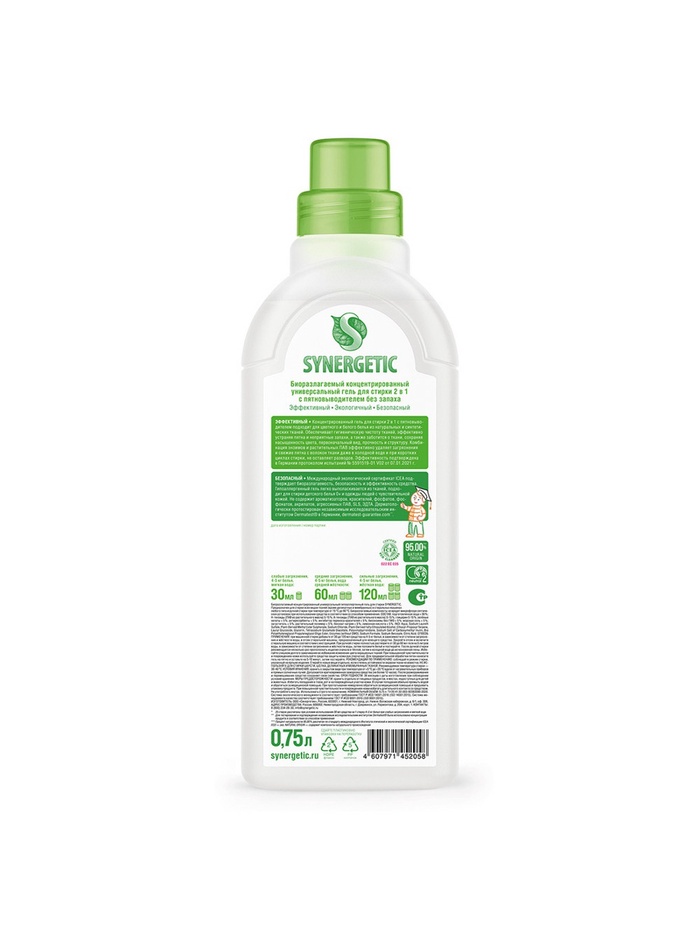 Биоразлагаемый концентрированный гель для стирки 2 в 1 c пятновыводителем SYNERGETIC предназначен для использования в стиральных машинах любого типа, ручной стирки при температуре 15 - 90 °C, а также для предварительной обработки пятен.