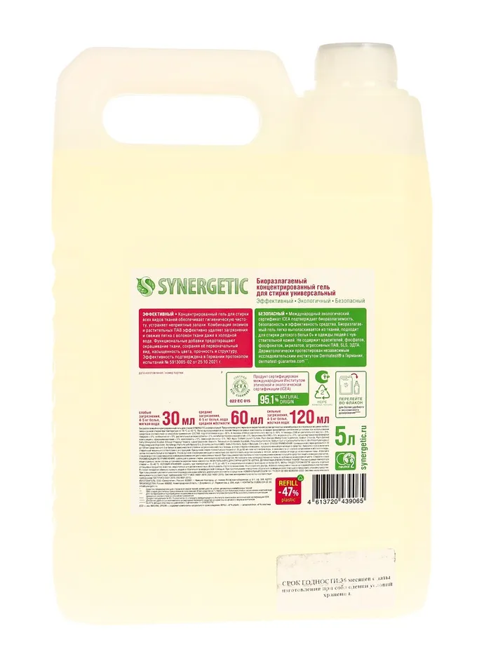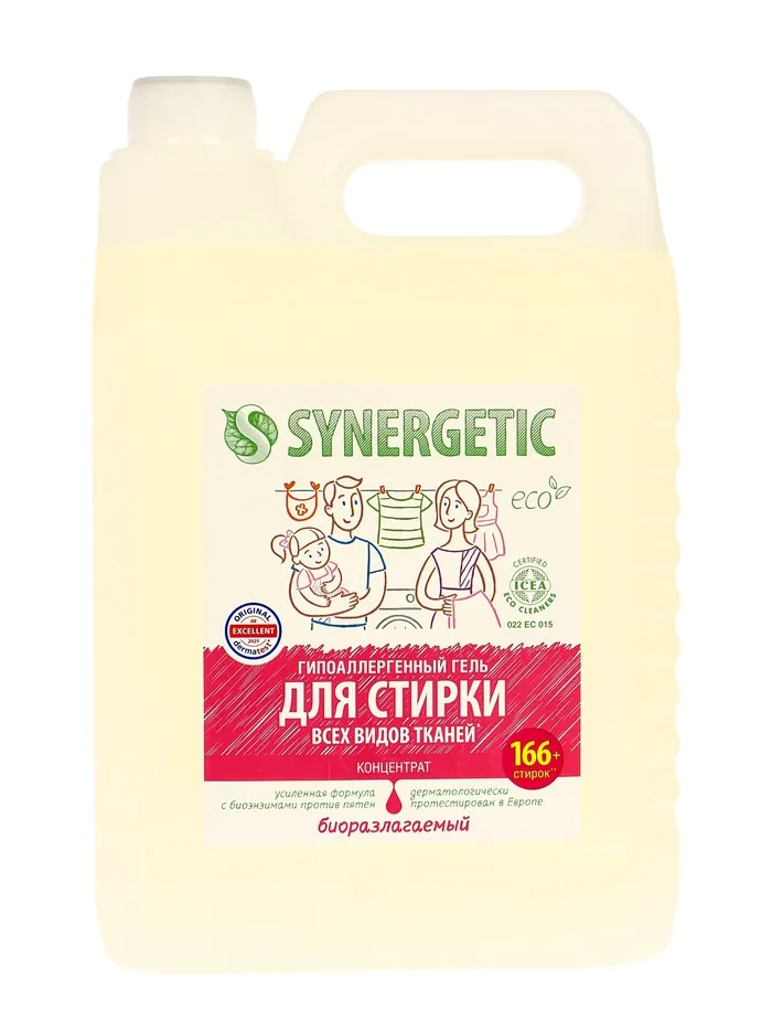 Биоразлагаемый концентрированный гель для стирки SYNERGETIC универсальный обеспечивает бережное и эффективное очищение тканей, гигиеническую чистоту одежды и устраняет неприятные запахи. Комбинация энзимов и растительных ПАВ эффективно удаляет загрязнения и свежие пятна с волокон ткани даже в холодной воде.