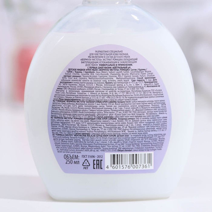 Жидкое туалетное мыло Формула чистоты Детское с ромашкой 250 мл. Крем-мыло жидкое дает устойчивую высокую пену. Прекрасно смывает любые загрязнения, в том числе животный и растительный жиры, машинные масла. Удаляет неприятные запахи. Бережно ухаживает и увлажняет кожу рук. Обладает приятными естественными ароматами. Не требует большого расхода.