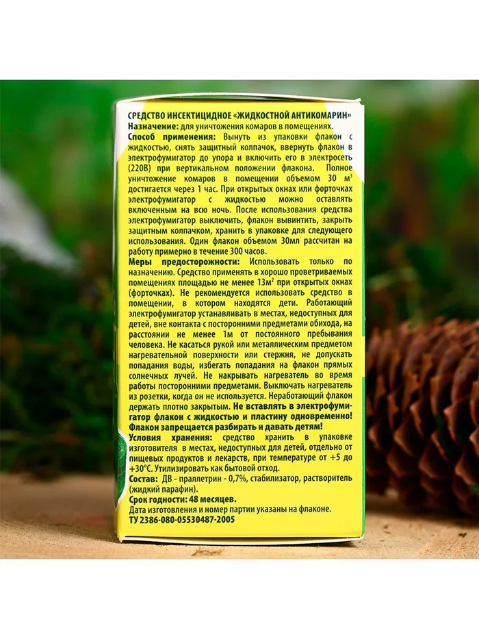 Описание: инсиктицидное средство от комаров.Назначение: для уничтожения комаров в помещениях.Меры предосторожности: использовать только по назначению. Применять в хорошо проветриваемых помещениях площадью не менее 13 м2 при открытых окнах (форточках). Не использовать одновременно флакон с жидкостью и пластины в одном электрофумигаторе. Флакон запрещается разбирать и давать детям.Состав: ДВ - праллетрин - 0,7 %, стабилизатор, растворитель (жидкий парафин).Срок годности: 48 месяцев.