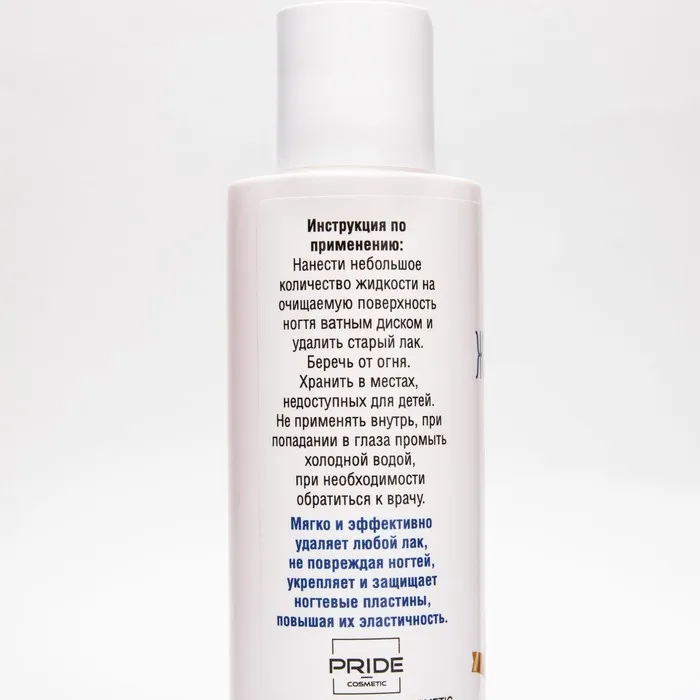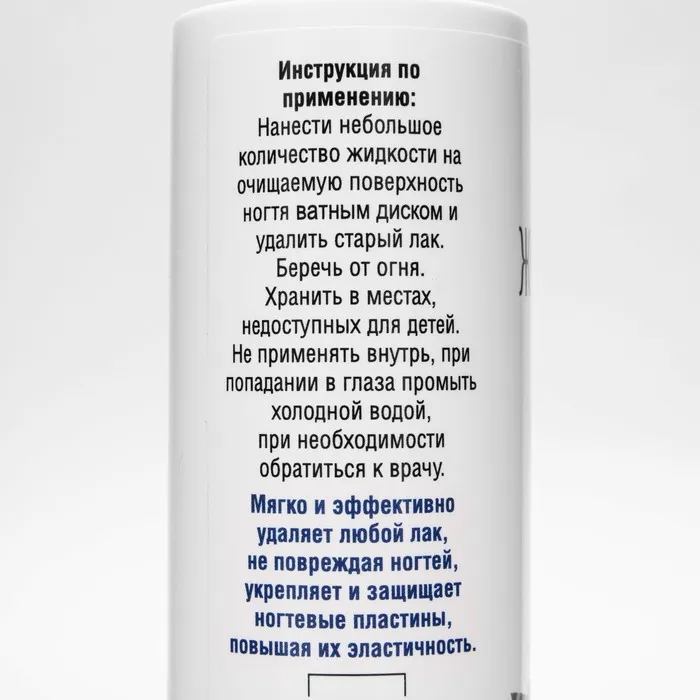 В составе имеет ацетон. Легко удаляет любые виды лаков и блесток. Не сушит ногти. Имеет легкий приятный аромат. Подходит для регулярного применения.