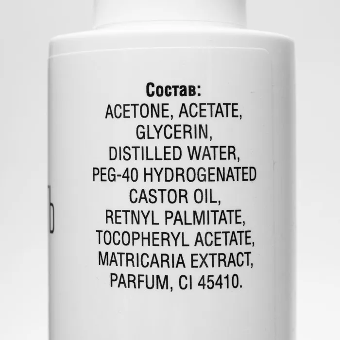 Состав: ACETONE, ACETATE, GLYCERIN, DISTILLED WATER, PEG-40, HYDROGENATED CASTOR OIL, RETNYL PALMITATE, TOCOPHERYL ACETATE, MATRIACARIA EXTRACT, PARFUM, CL 45410.