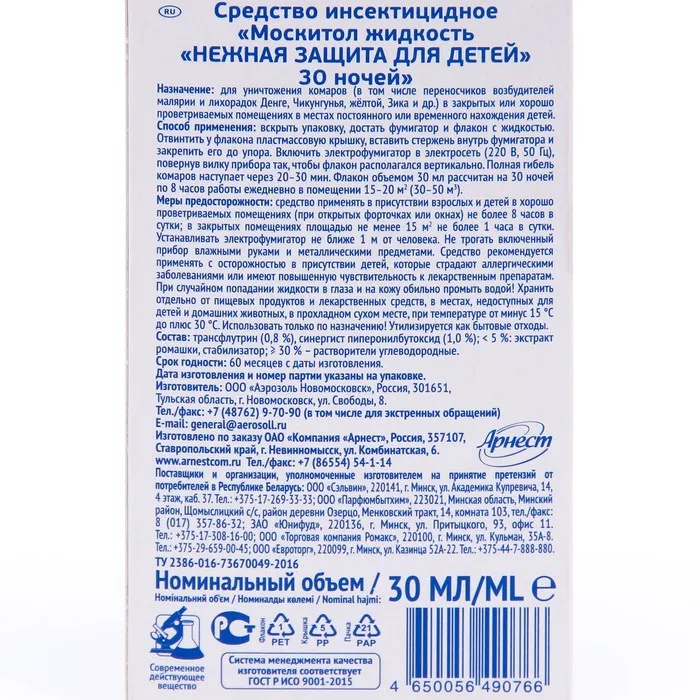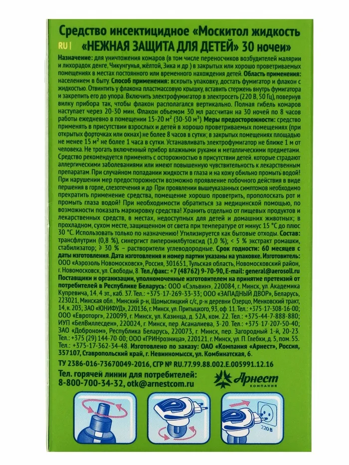 ОписаниеСредство инсектицидное Москитол, жидкость от комаров Защита для всей семьи уничтожает комаров, москитов, мокрецов и других кровососущих насекомых за 20-30 минут в комнате 15-20 м2.Эффект от применения средства от комаров заметен уже через 3-5 минут. Одного флакона жидкости против комаров и насекомых Москитолл хватает на 60 дней при условии 8 часовой работы прибора ежедневно.Репеллентное средство - электро фумигатор - необходимо устанавливать не ближе 1 м от человека, его можно использовать при детях только после получасового проветривания помещения. Взрослым рекомендуется не находиться в помещении с работающим электрофумигатором дольше часа.Жидкость от комаров следует использовать с осторожностью в присутствии людей с аллергией на лекарства, страдающих от астмы. Не рекомендуется использовать репеллент - жидкость против комаров Mosquitall в присутствии беременных или кормящих женщин.Нельзя прикасаться к работающему прибору мокрыми или влажными руками, а также металлическими предметами.Фумигатор приобретается отдельноСпособ применения. Вскрыть упаковку, достать фумигатор и флакон с жидкостью. Отвинтить у флакона пластмассовую крышку, вставить стержень внутрь фумигатора и закрепить его до упора. Включить электрофумигатор в электросеть (220 В, 50 Гц), повернув вилку прибора так, чтобы флакон располагался вертикально. Состав: трансфлутрин (1,4 %), синергист пиперонилбутоксид (1,5 %), < 5 % – стабилизатор Агидол, ≥ 30 % – растворители углеводородные.