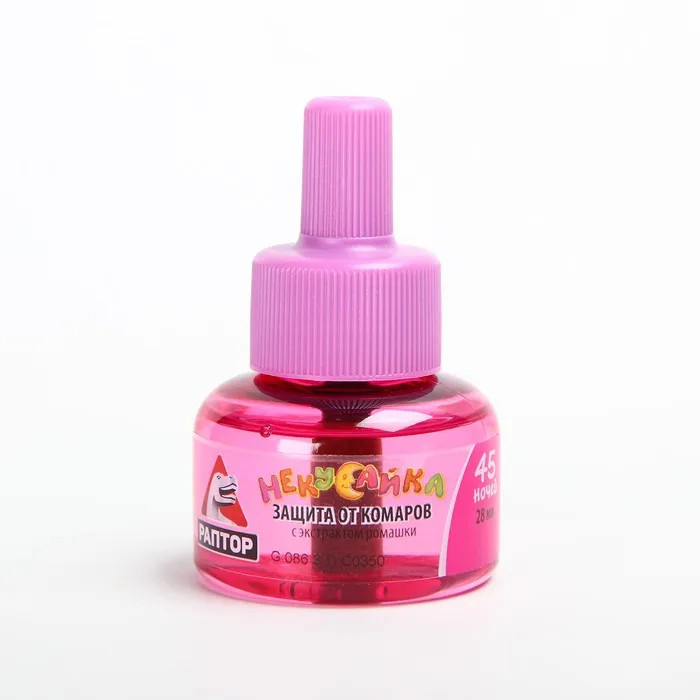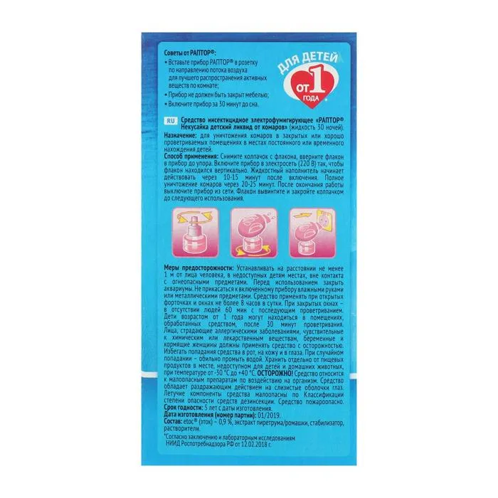 Когда в семье появляется малыш, приоритеты родителей смещаются в сторону обеспечения максимально комфортных и безопасных условий его жизни. Раптор поддерживает такой подход и представляет вашему вниманию детскую линию средств защиты от комаров Раптор некусайка, специально разработанную для малышей и официально разрешённую к использованию с первого года жизни. Приобретая комплект Раптор некусайка, вы получаете надёжное средство защиты вашего ребёнка от комаров + несколько часов спокойного сна для остальных членов семьи. Удобный и надёжный универсальный прибор можно использовать как с жидкостью, так и с пластинами от комаров Раптор некусайка. Итальянское производство, инновационная формула, включающая в себя натуральный экстракт далматской ромашки, которая является одним из старейших веществ растительного происхождения, применяемая как природный инсектицид и действующее вещество, разработанное в Японии - всё это уже оценили по достоинству сотни тысяч семей, доверив Раптор некусайка заботу о самом дорогом, что них есть - своих малышах! Присоединяйтесь и вы к фан-клубу Раптор некусайка и получите возможность воспользоваться эксклюзивным промо-предложением - 50% жидкости в подарок! Секрет популярности детского комплекта Раптор некусайка: Бережная защита малышей от комаров в помещении. Официально подтверждённая безопасность для детей от года. Универсальный прибор: работает как с жидкостью, так и с пластинами. Световой индикатор работы прибора. В составе жидкости содержится пиретрум - натуральный экстракт далматской ромашки. Средство гипоаллергенно.