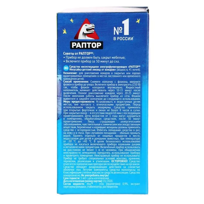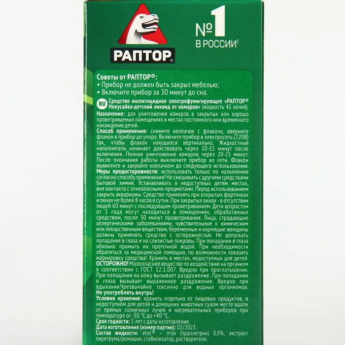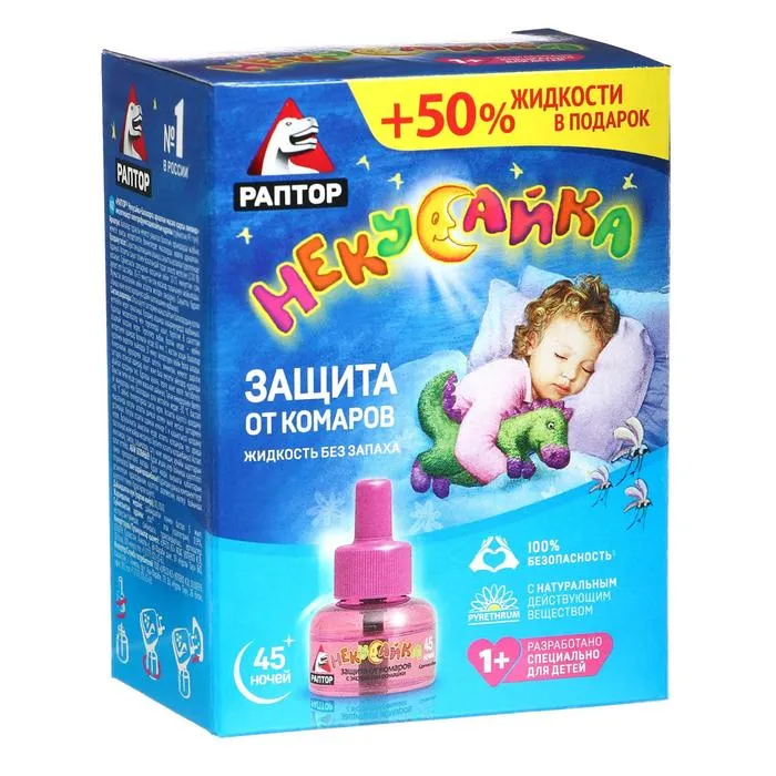 Жидкость от комаров Раптор Некусайка для детей 45 ночей + 50 % в подарок — Характеристики