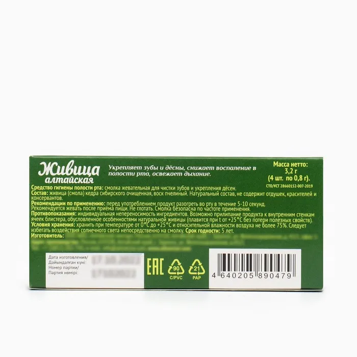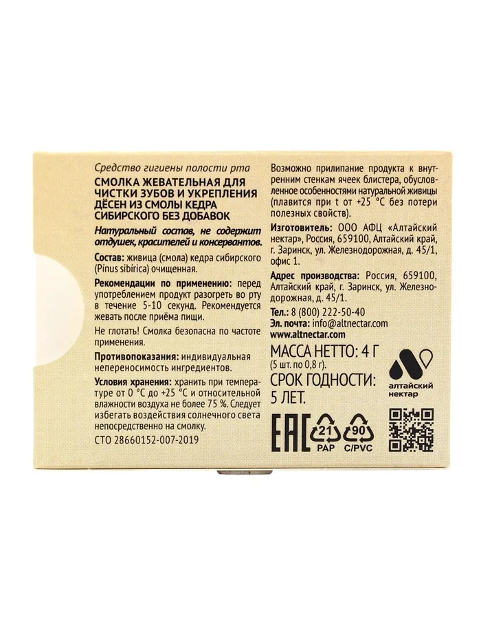 Состав: живица алтайского кедра, пчелиный прополисный воск.