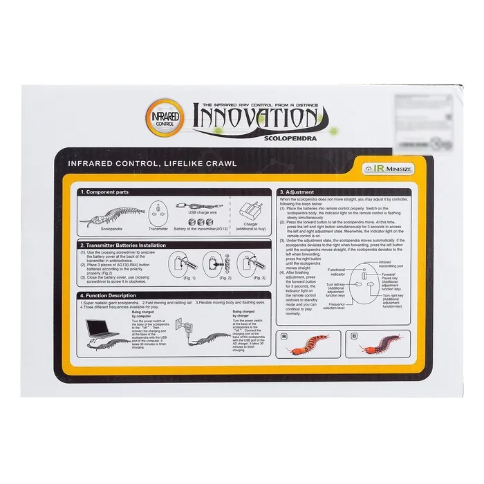 - Радиоуправление: управляйте сороконожкой на расстоянии до 15 метров. Пульт работает от 3 батареек AG13, которые обеспечивают стабильное подключение без помех.