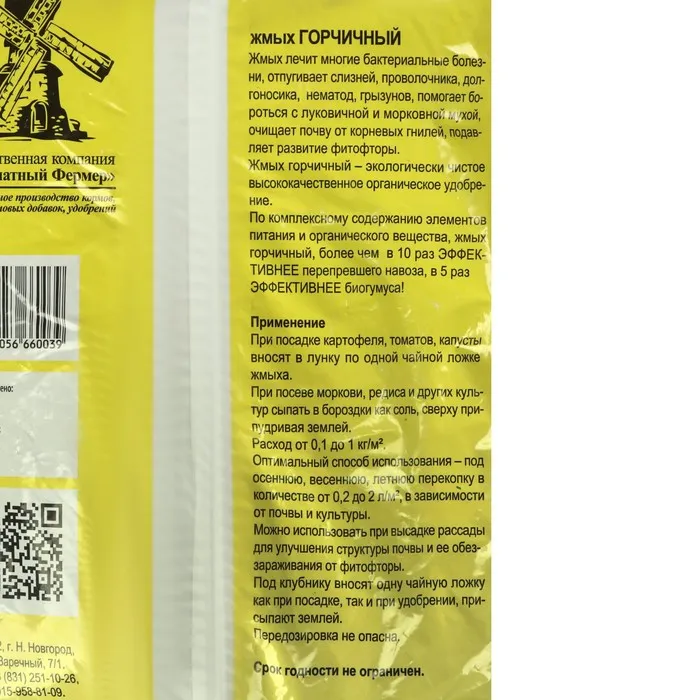 Содержание в жмыхе жирных кислот и эфирных масел придаёт удобрению фитосанитарную функцию – лечит многие бактериальные болезни, отпугивает слизней, проволочника, долгоносика, нематод, грызунов, муравьев, помогает бороться с луковичной и морковной мухой, очищает почву от корневых гнилей, подавляет развитие фитофторы. Жмых горчичный – экологически чистое высококачественное органическое удобрение представленное в виде, однородного по составу крупно помолотого порошка, получаемого в результате переработки семян горчицы.