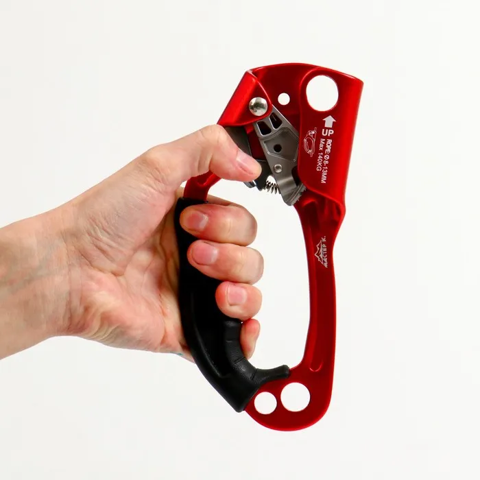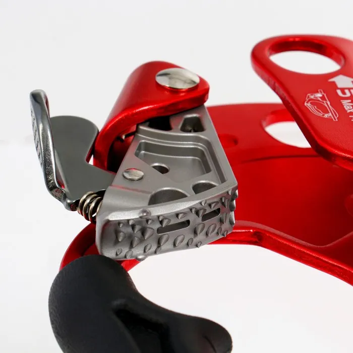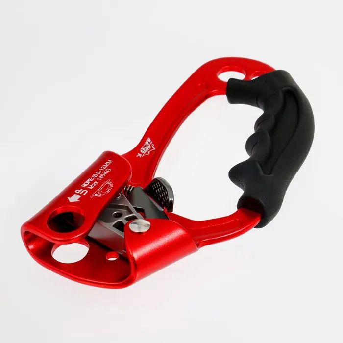 Жумар (или зажим) необходим для подъема по вертикальным или наклонным перилам. Он достаточно прост в использовании – представляет собой зажим, двигающийся вверх. А вот движение вниз на нем блокирует специальный кулачок с шипами, который при тяге упирается в веревку.