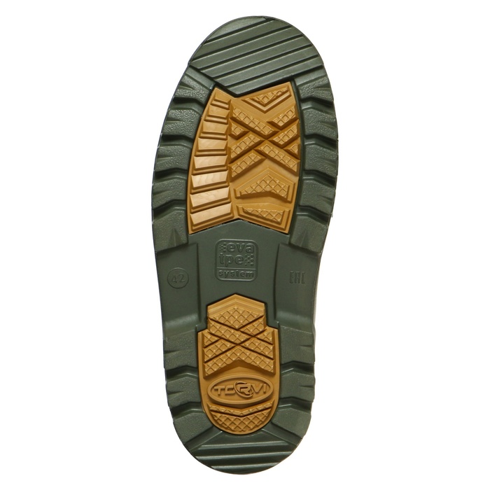 Верх сапога выполнен из цельнолитого ЭВА. Он выдерживает действительно низкие температуры и, в отличие от обычной резины, остается эластичным, не трескается.