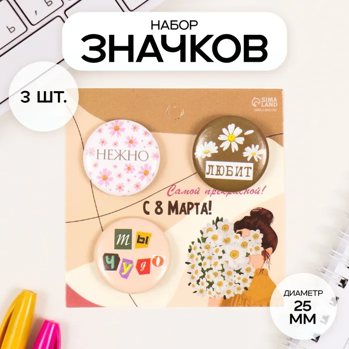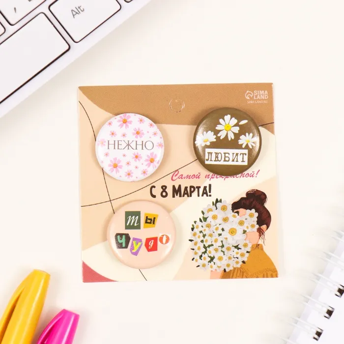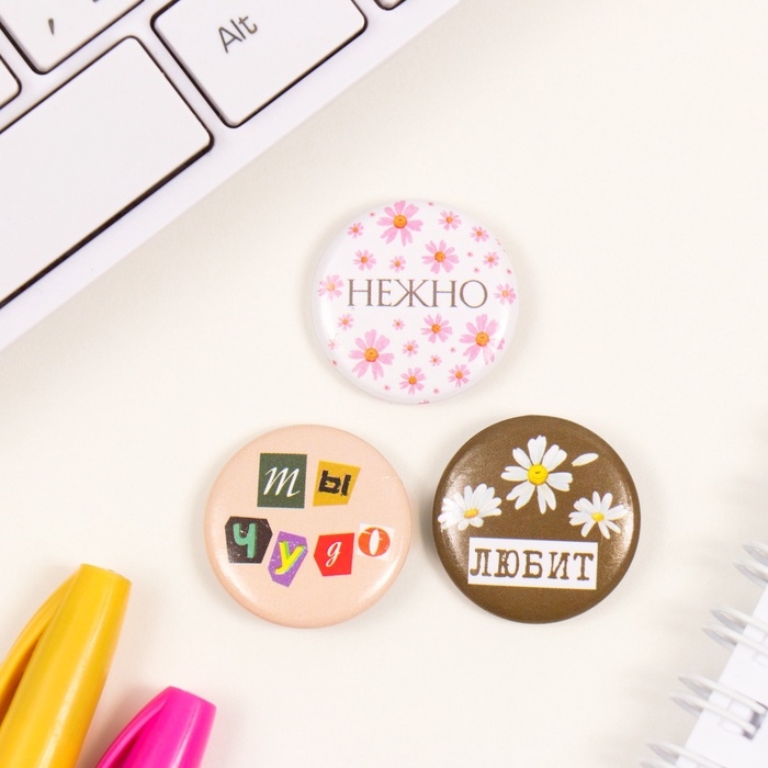Значки закатные набор 3 шт d=25 мм "Любит" 7х7 см — Характеристики