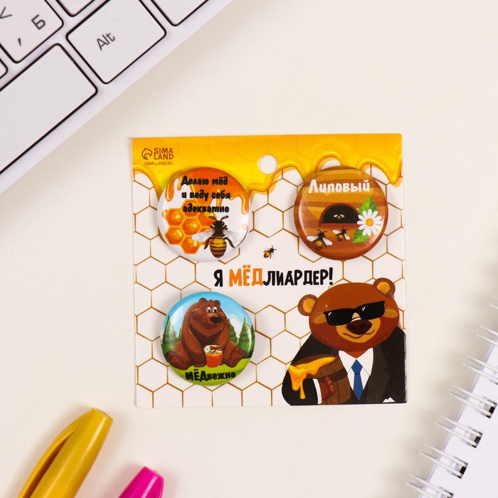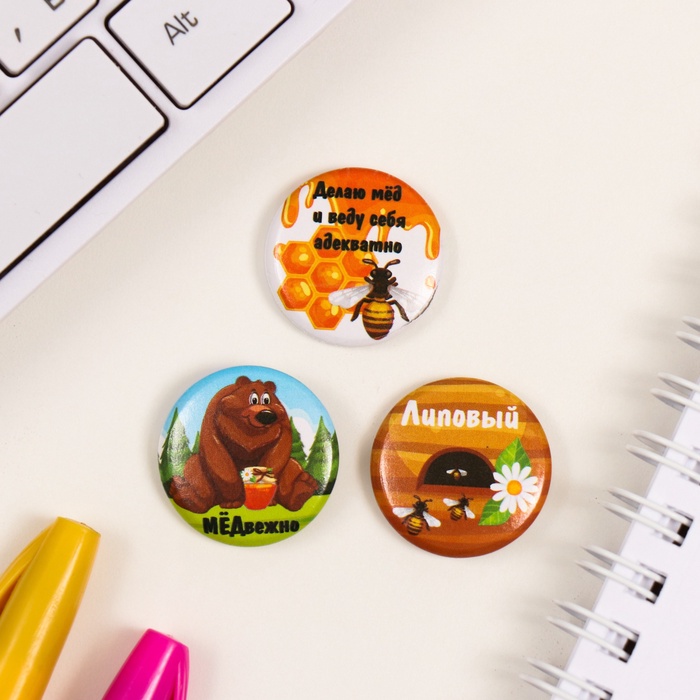 Значки закатные набор 3 шт d=25 мм "Мёд" 7х7 см — Характеристики