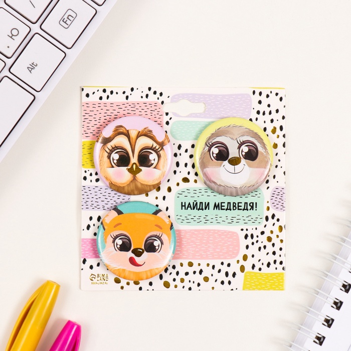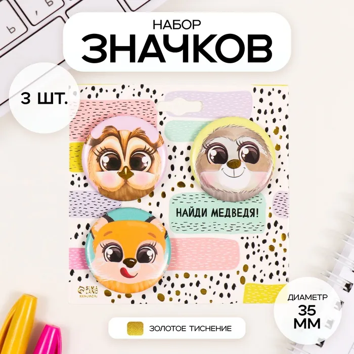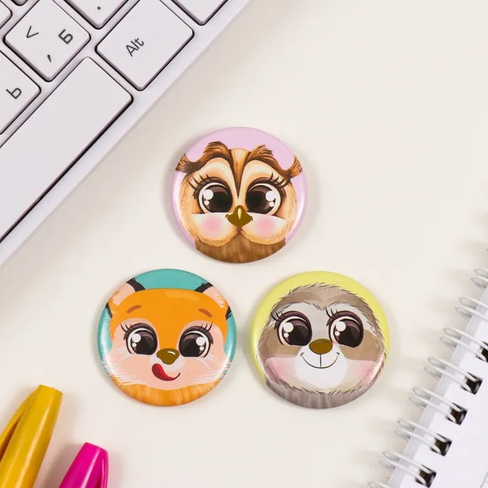 Значки закатные набор 3 шт d=35 мм "Милые зверушки" с тиснением 9х9 см — Характеристики