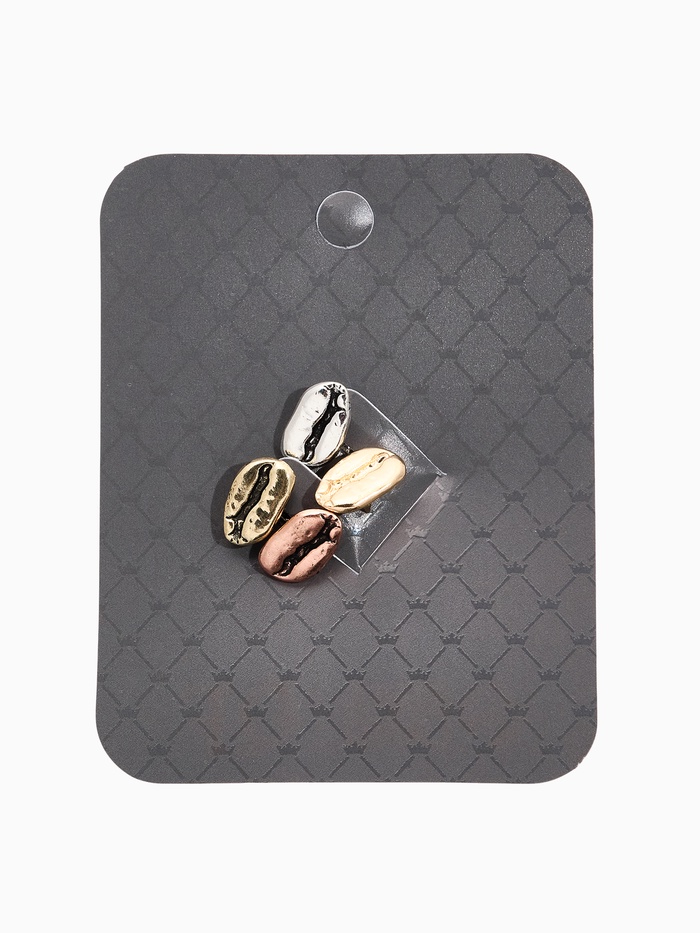 Окунитесь в атмосферу кофейного ритуала и ароматного утра с набором из четырёх стильных значков в виде зёрен кофе, выполненных в металле и украшенных миксом оттенков. Каждый значок представляет собой крошечный фрагмент настоящего зерна, выполненный с максимальной точностью и детализацией, словно только что извлечённый из упаковки любимого сорта кофе.