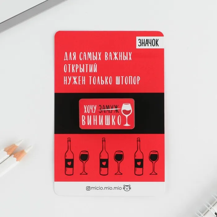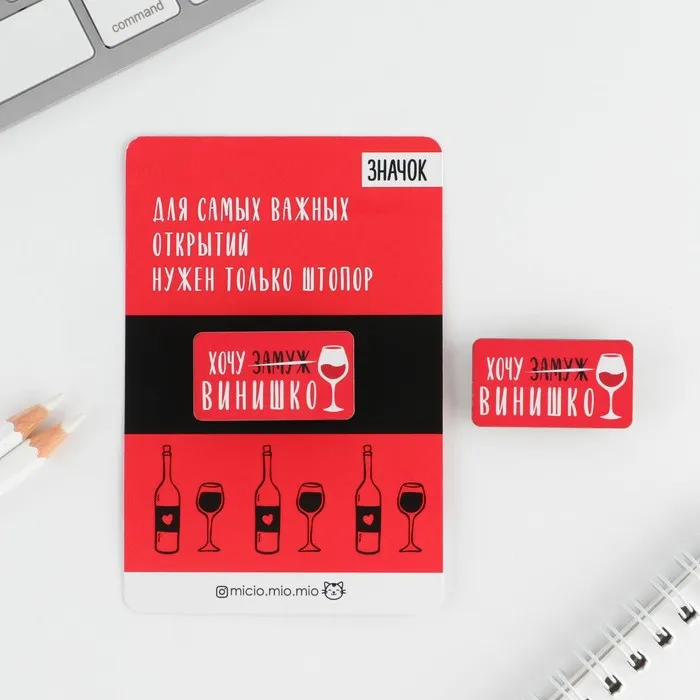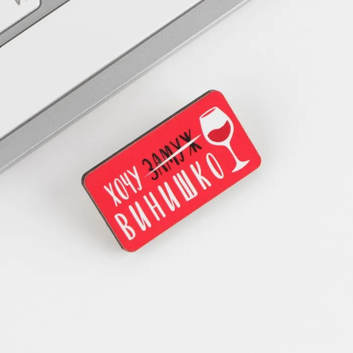 Значок «Хочу винишко». Яркий способ выделить себя в толпе, показать свою индивидуальность. Значок лёгкий и долговечный, надежно и безопасно крепится с помощью булавки к одежде, что позволяет использовать его без ограничений для всех возрастных категорий.