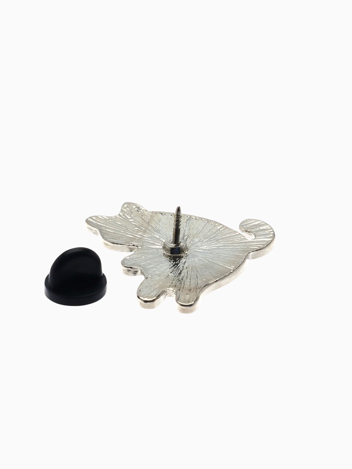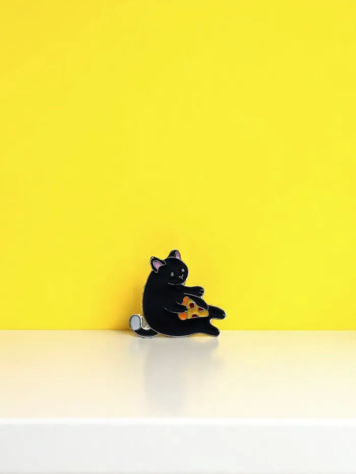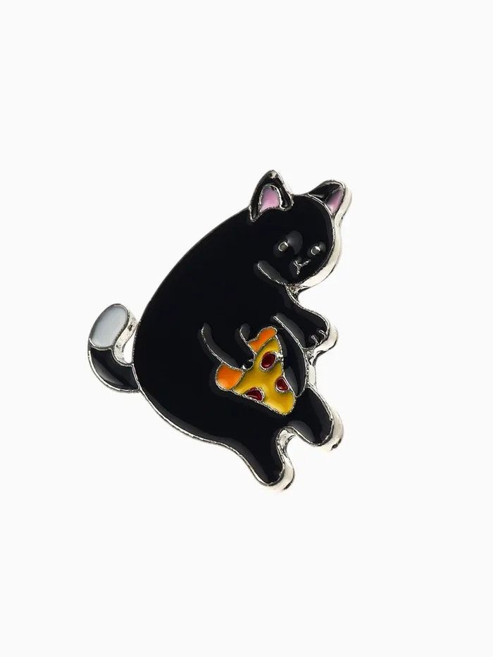 Этот забавный значок с изображением кота, держащего аппетитный кусочек пиццы, добавит яркости и игривости в любой образ. Изящный серебристый оттенок фурнитуры гармонично сочетается с насыщенными цветами эмали — чёрным, жёлтым, оранжевым и красным, создавая стильный и выразительный аксессуар.