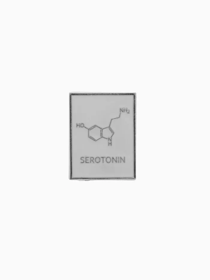 Представляем вам уникальный значок, который станет не только стильным аксессуаром, но и символом заботы о здоровье и благополучии — значок с изображением молекулы серотонина. Выполненный в белом цвете с элегантной серебряной фурнитурой, этот значок привнесет нотку научного шарма в любой образ.
