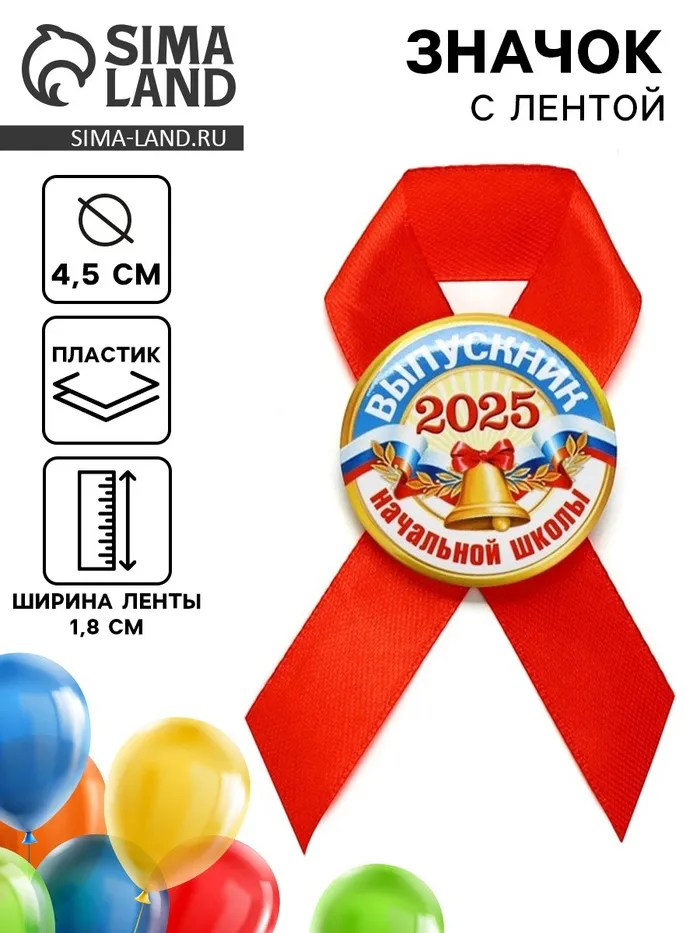 Значок с лентой на выпускной «Выпускник начальной школы 2025», диам 4.5 см — Характеристики