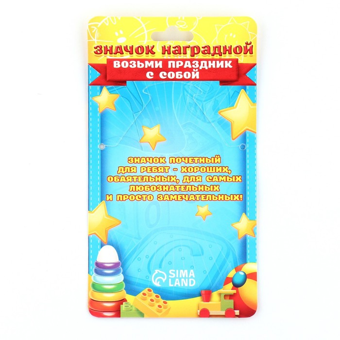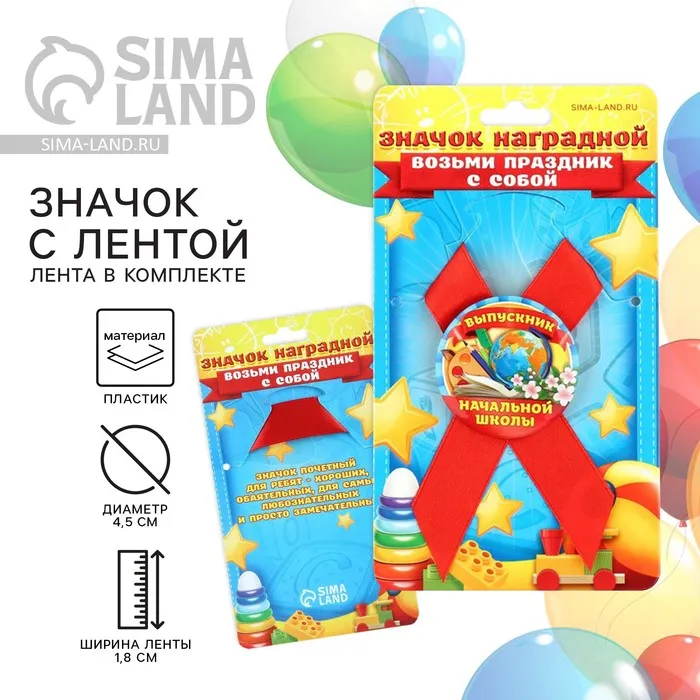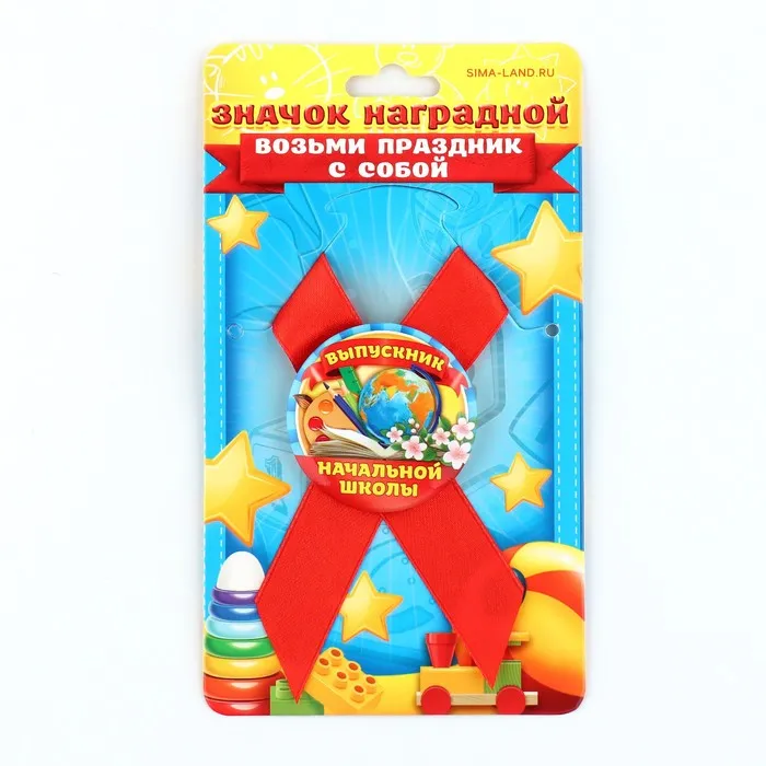 Выпускной - это особое событие для каждого ребёнка. Сувенир изготовлен из лёгкого пластика и декорирован яркой текстильной лентой шириной 1,8 см. Изделие дополнено булавкой на оборотной стороне, так что его сразу можно надеть на счастливого получателя. Каждый значок на булавке с лентой прикреплен к яркой, нарядной подложке - открытке, ребенку будет вдвойне приятно получить такой презент