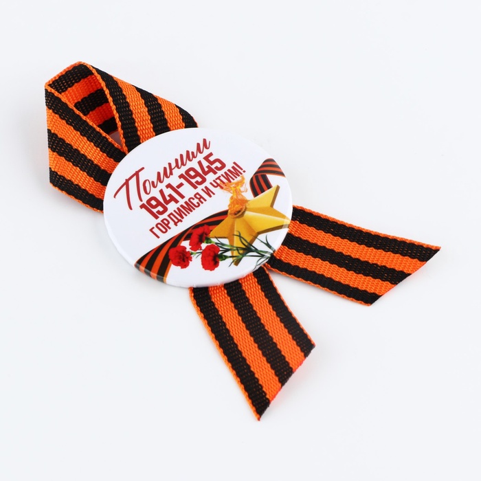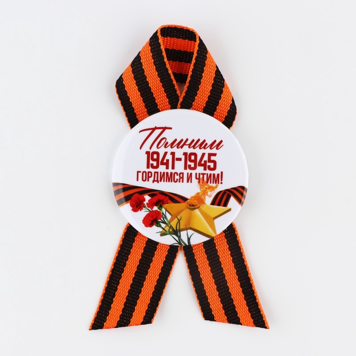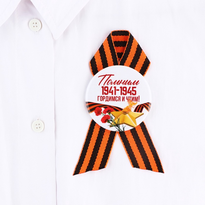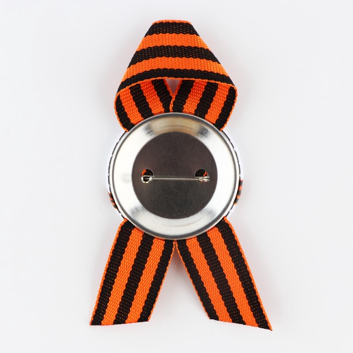 Георгиевская лента - главный атрибут и символ Дня Великой Победы. Ленточка дополнена металлическим значком-орденом с эксклюзивным дизайном. Изделие крепится с помощью булавки. Диаметр значка составляет 5,6 см.