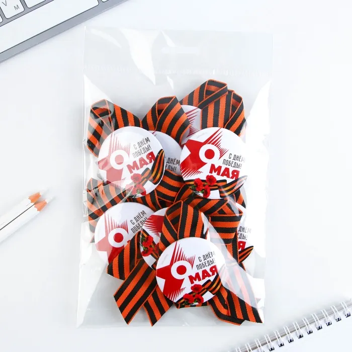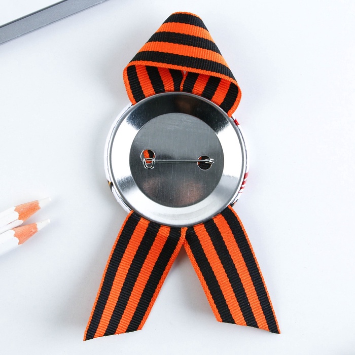Георгиевская лента - главный атрибут и символ Дня Великой Победы. Ленточка дополнена металлическим значком-орденом с эксклюзивным дизайном. Изделие крепится с помощью булавки. Диаметр значка составляет 5,6 см.